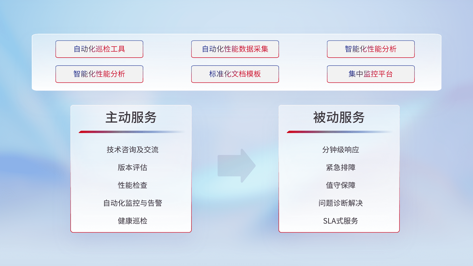 智能化工具和标准化文档,,,保障服务质量,,,提供主动服务(包含技术咨询、、、版本评估、、、性能检查、、、自动化监控与告警、、、、健康巡检)和被动服务包含(分钟级响应、、、紧急排障、、、值守保障、、问题诊断解决、、SLA服务)。。