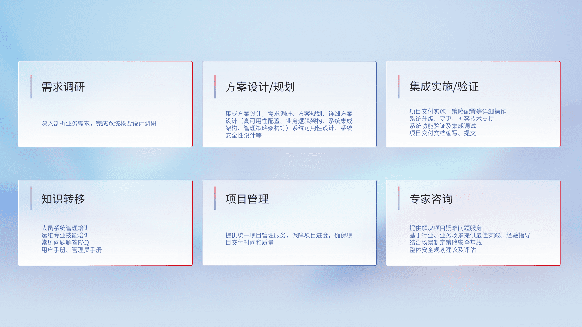 针对客户行业特性,,将宏观的安全战略和需求,,,,通过专业的交付服务,,,实现项目落地,,为客户提供标准规范的集成交付服务。。。。